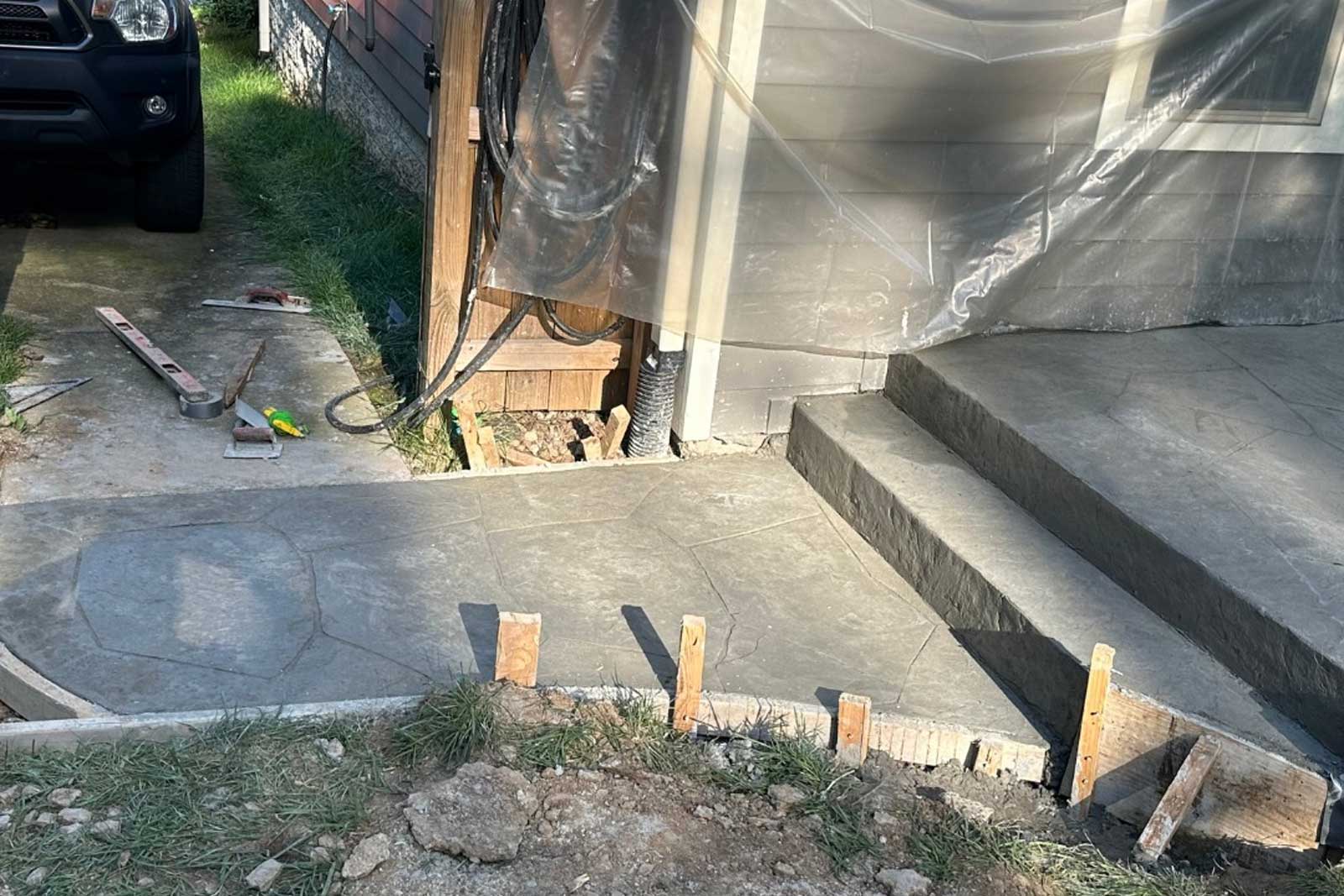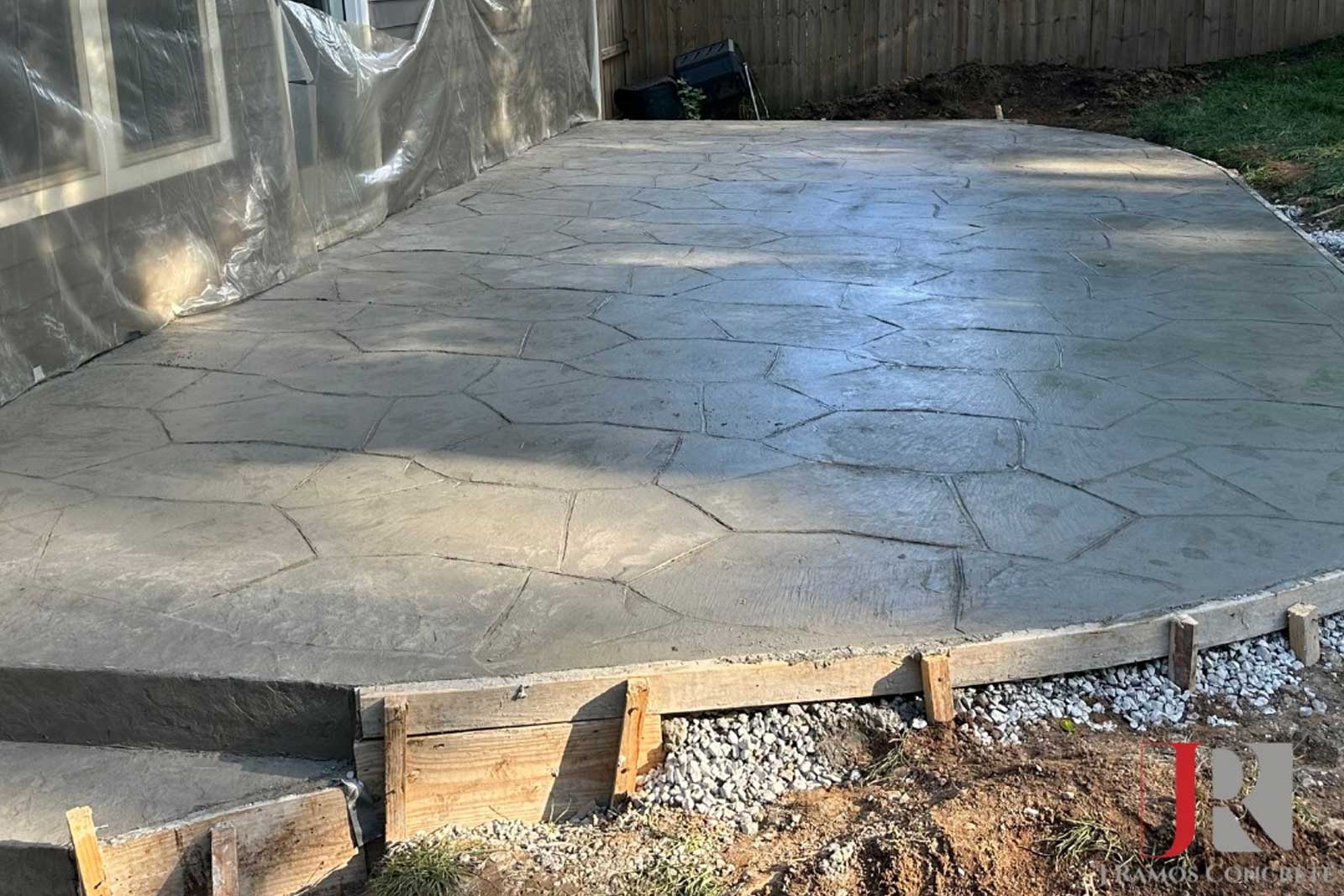 Stamped concrete patio installation at a residential home, designed to add usable outdoor living space with a decorative stone-style finish.